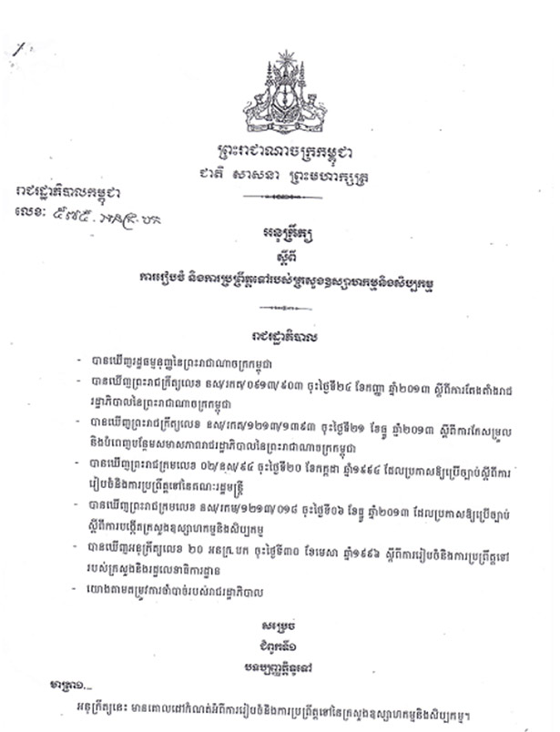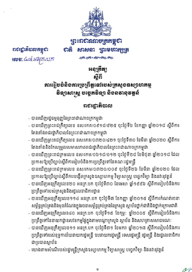 អនុក្រឹត្យស្តីពីការរៀបចំនិងការប្រព្រឹត្តទៅរបស់ក្រសួងឧ.វ.ប.ន